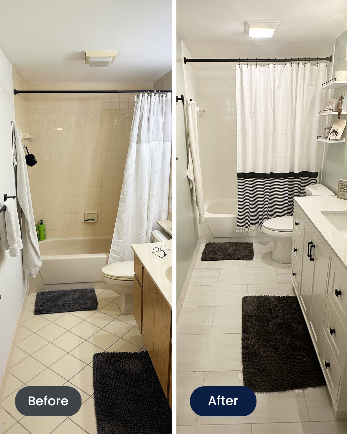 Replaced floor tile, vanity, mirror, fixtures, shelving, and hardware.