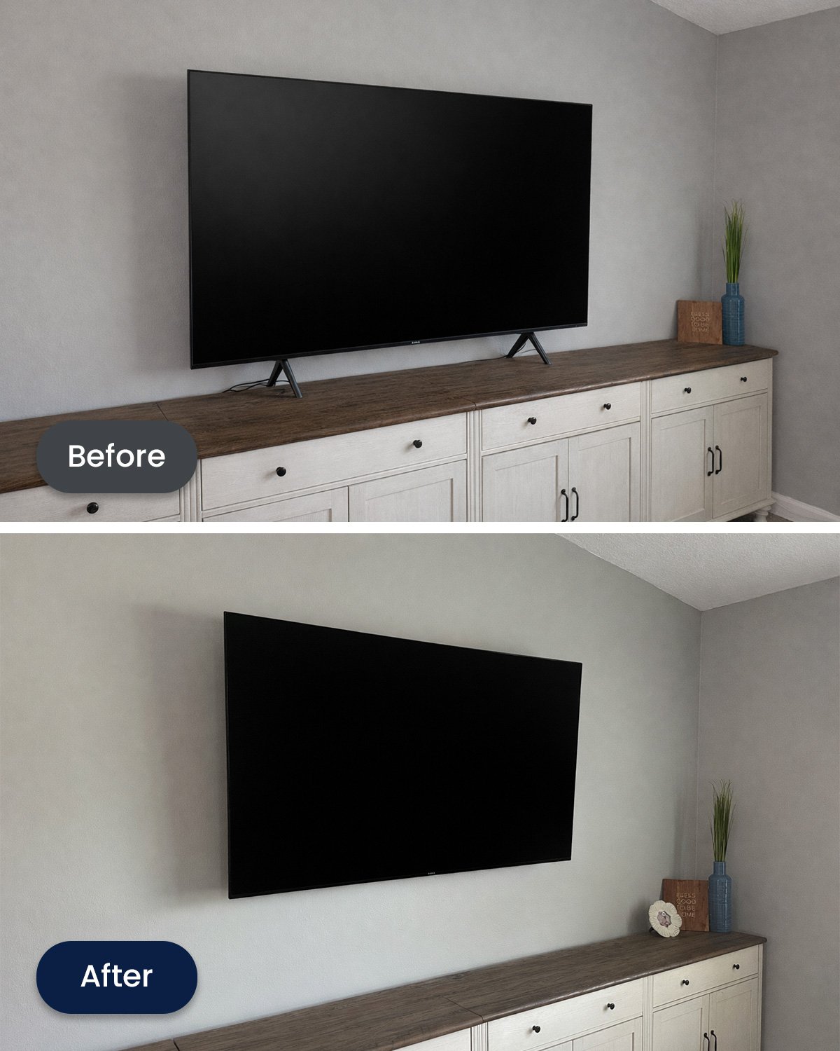 Mounted TV with hidden wiring for a clean, modern focal wall.